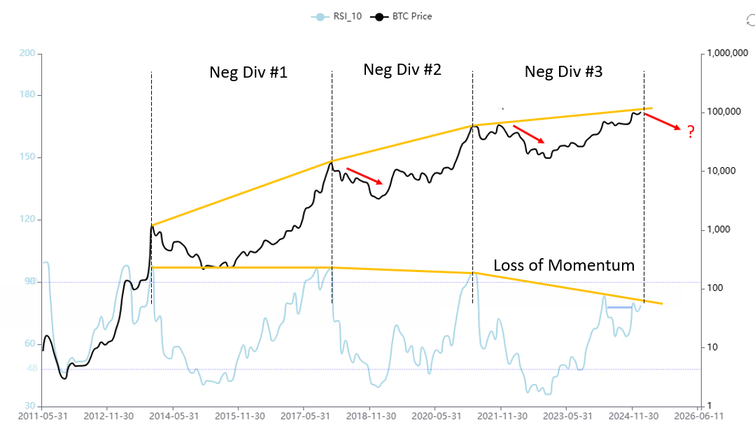 The last RSI negative divergence is most pronounced, signifying a loss of long-term momentum.