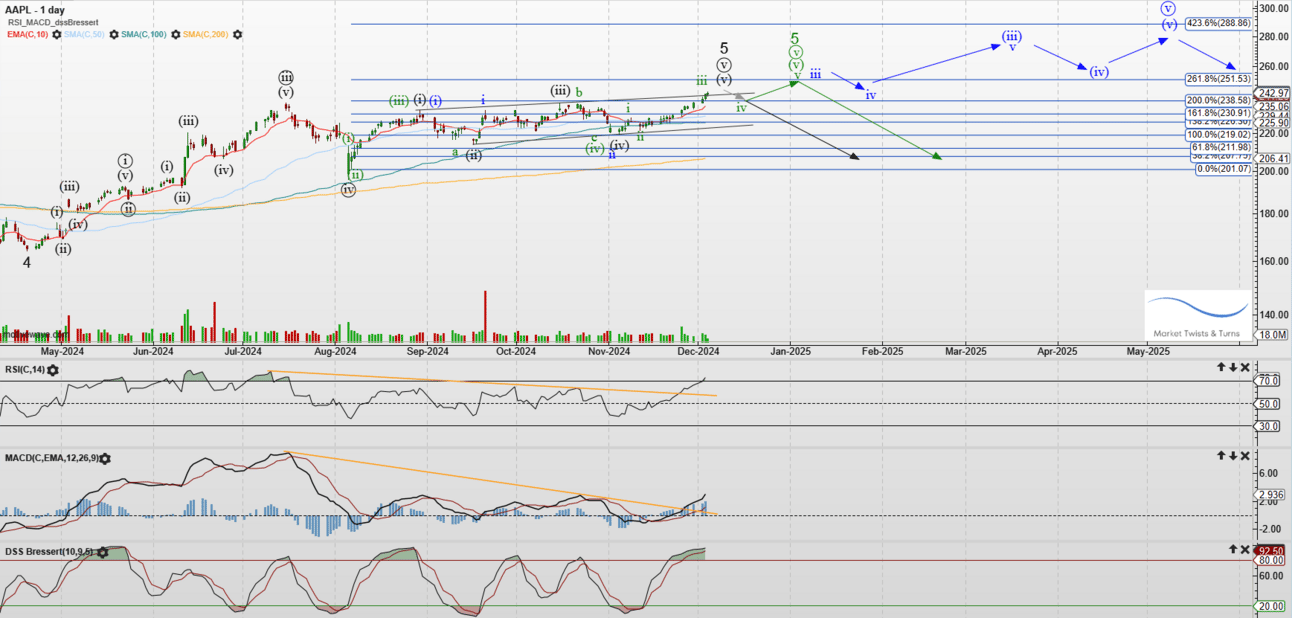 A few weeks ago, we considered AAPL deteriorating technical conditions and two competing ending diagonal counts for a possible top in AAPL price.