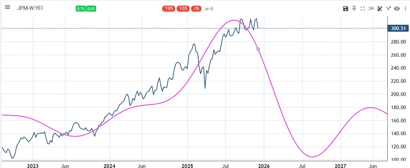 The three dominant cycles from the $JPM ( ▲ 0.8% ) weekly chart suggest weakness much of 2026.