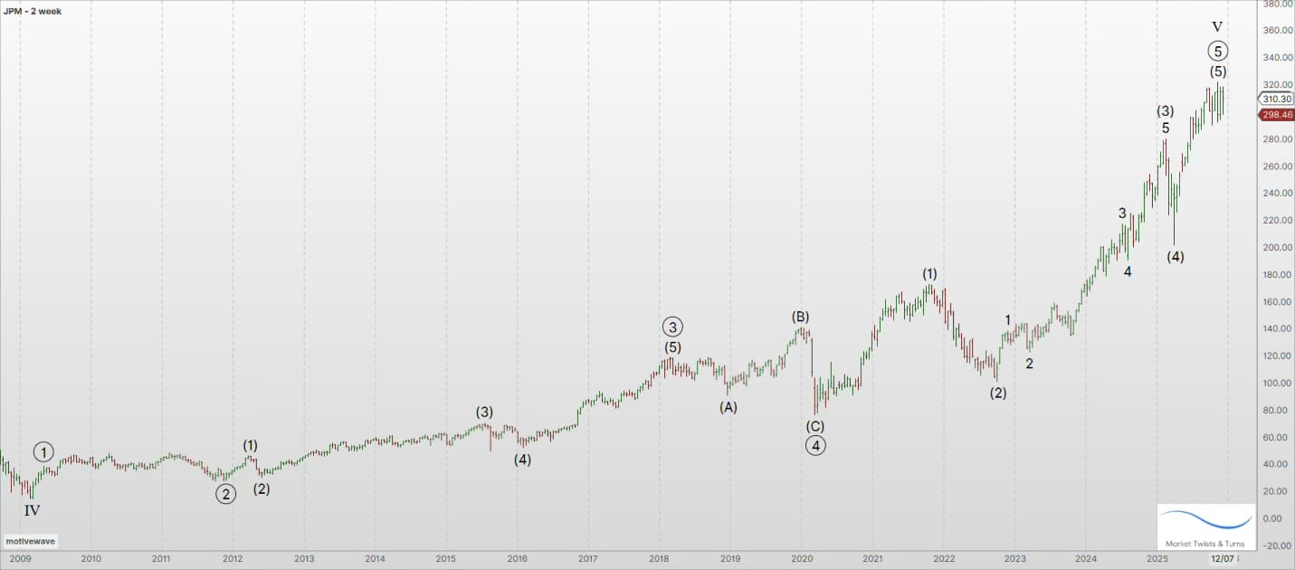 JPM has completed, or is about to do so, five primary waves from the 2009 low.