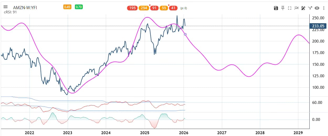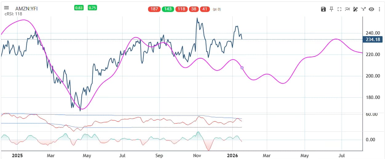 $AMZN ( ▼ 3.4% ) is not different; both the daily and the weekly chart cycle composites are pointing down, at least for another couple of months.
