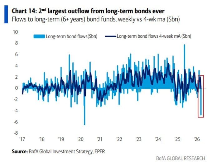 The attached chart (BofA Global Research) shows weekly net flows into long-term bond funds (maturity of 6+ years) from 2017 through early 2026.