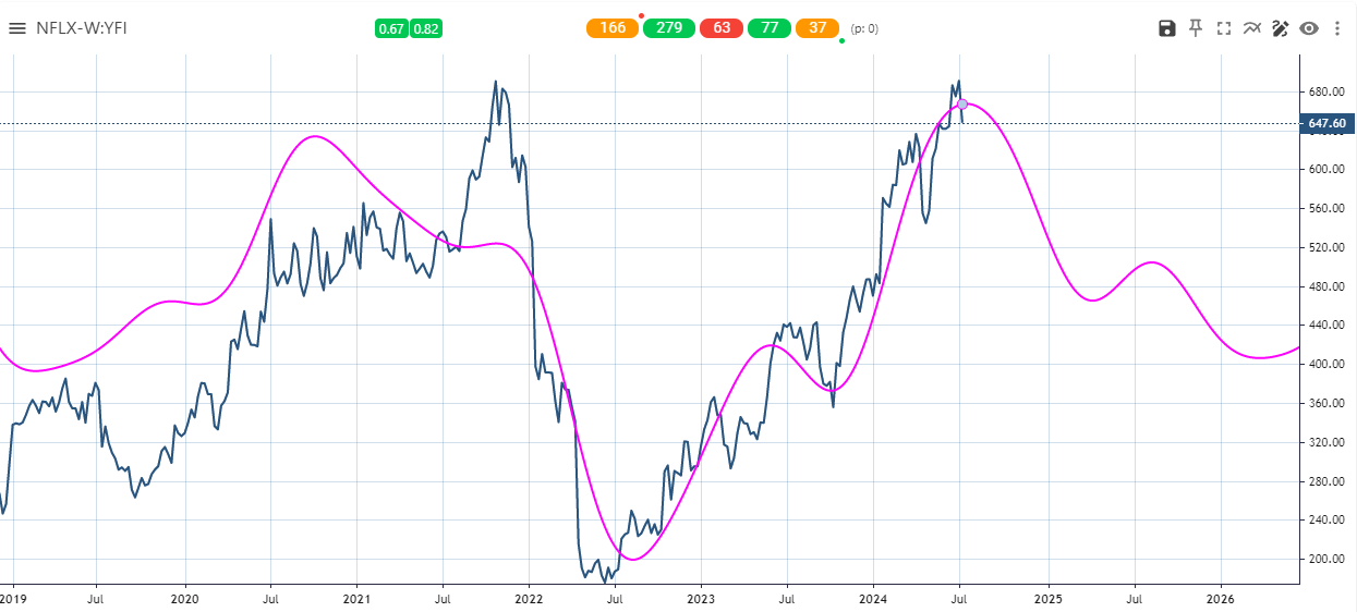 The NFLX’s weekly cycle composite rhymes with the EW count and the slide should continue into early 2025 and possibly beyond, TBD.