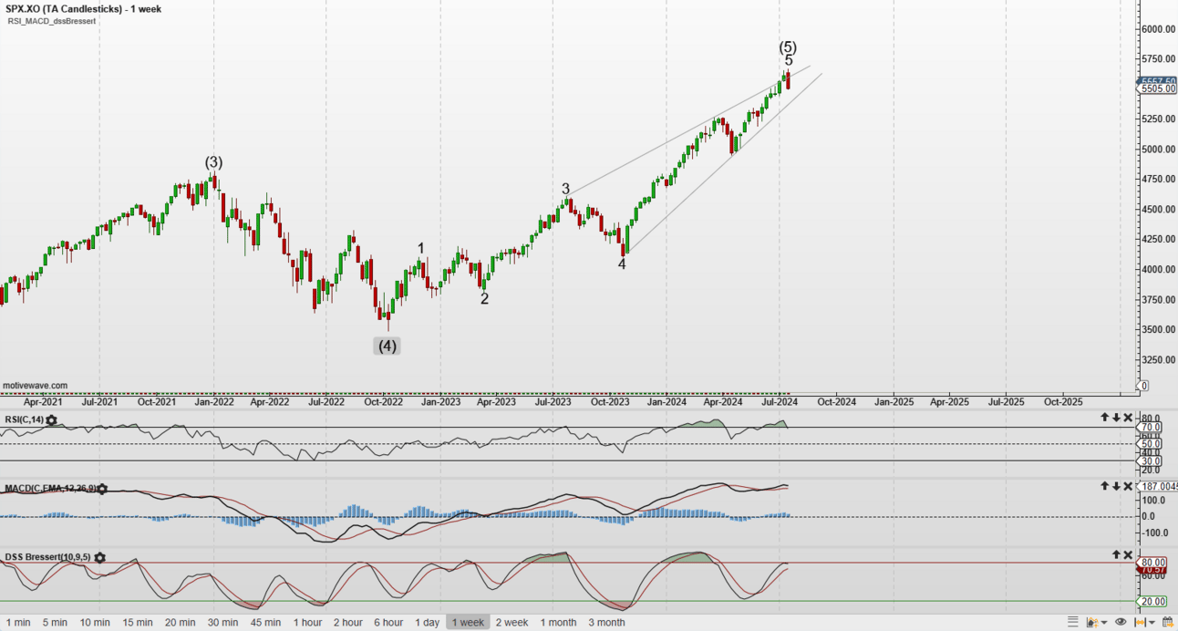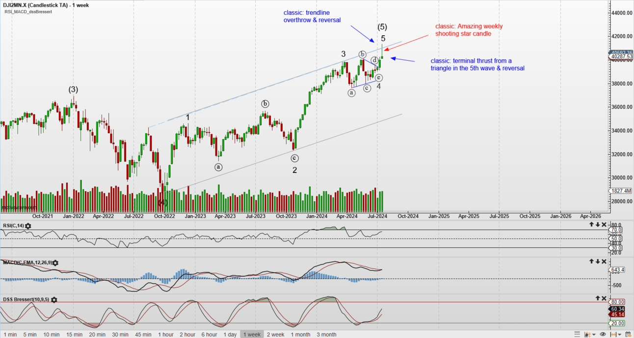 DJI completed 5 waves up from the Oct’22 low and likely 5 waves of a higher degree from the 2009 low. In Elliott Wave Theory (EWT) terms, this implies a significant correction to come.