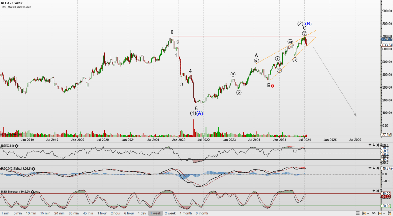 Indeed, NFLX bounced with an A-B-C to almost 2021 high, to form (2) or (B), from which it reversed in the last couple of weeks.