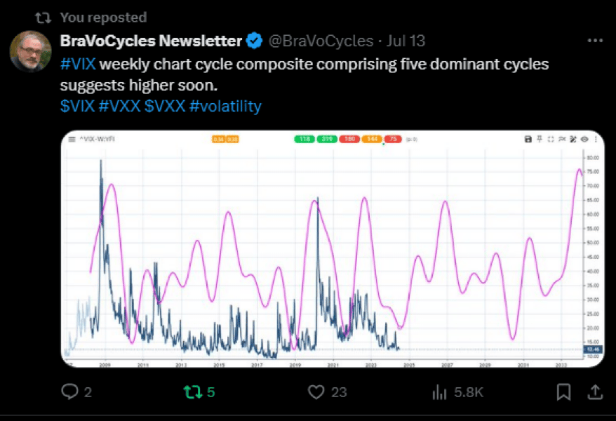 Last week, I posted hints/signals of a potential VIX reversal in the premium newsletter and more in real-time on X. Notably, I posted the weekly cycle composite of VIX a week ago on X. It caught the turn in VIX nicely (this degree of exactness does not always happen with weekly cycle composites, as they have larger tolerances).