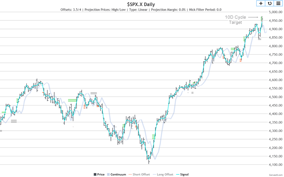 When the median price (cyan) crosses the FLD band, it generates a price target for the corresponding cycle. For example, in Figure 1, the SPX gapped up on Friday above the FLD band and generated a target of approximately 4950-4970 from Wednesday’s low.