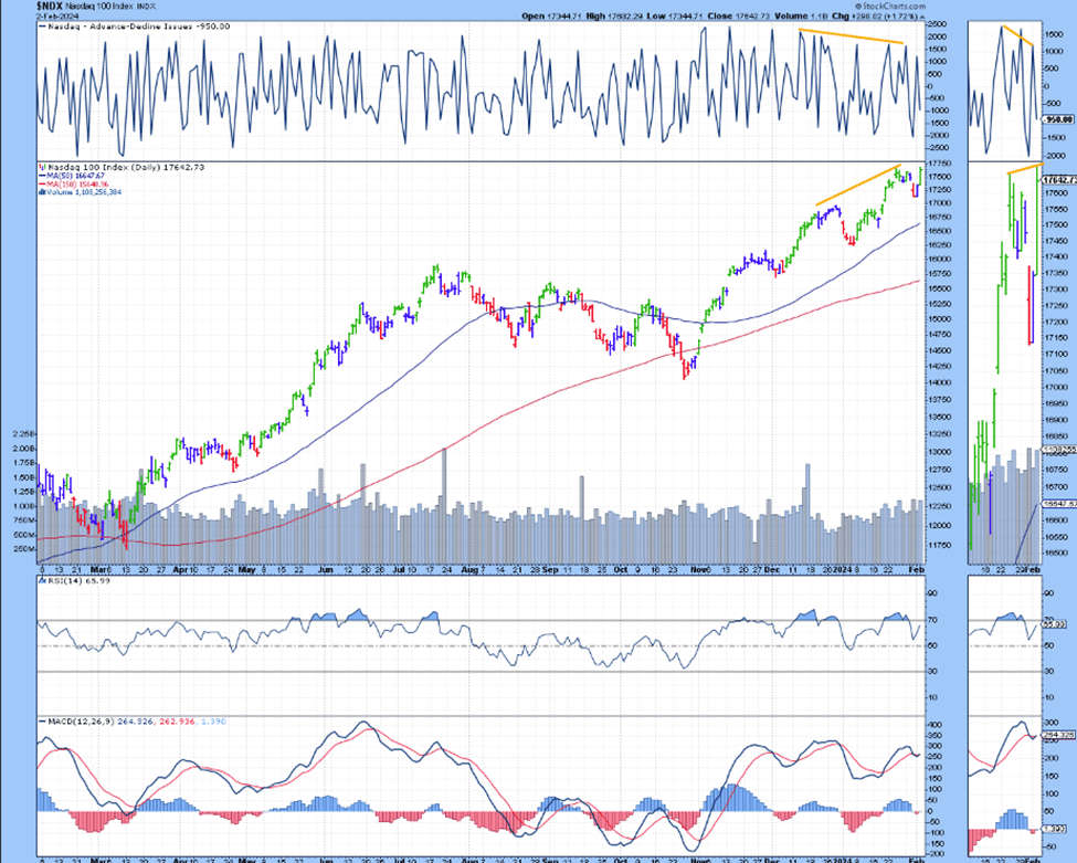 Market Internals are weak despite major indexes' 2-day strong “beach ball” bounce. Figure 2 shows the daily NDX technical chart with the advance/decline (A/D) line in the top window.