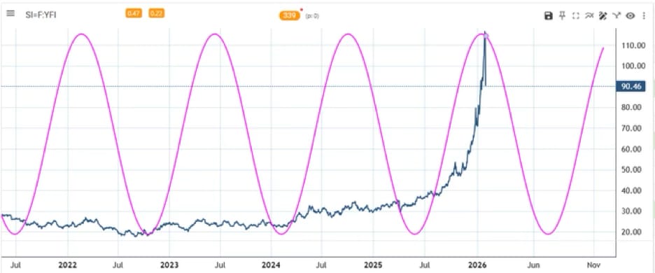 The chart below shows the dominant 5-year cycle in Silver; Multiple cycles and fundamentals drive the price, but the dominant cycle is something to pay attention to.