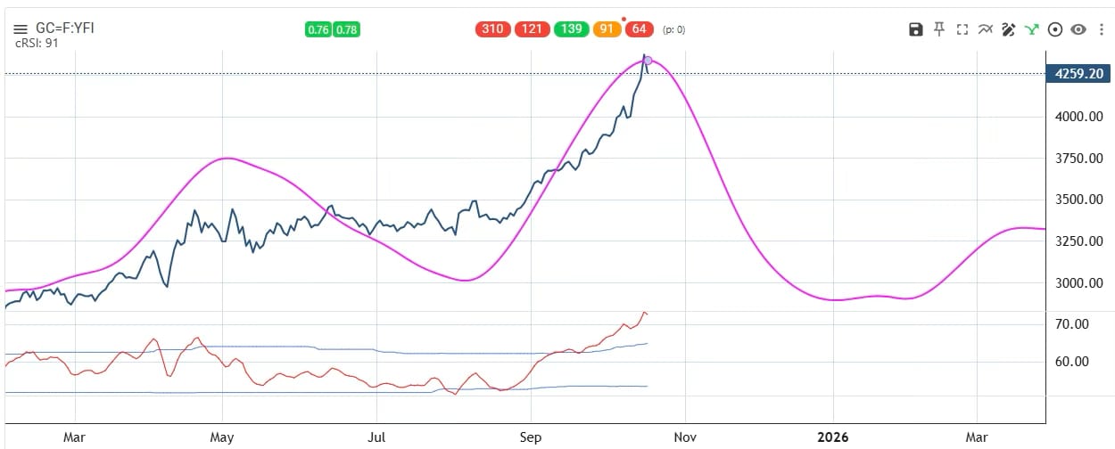 Gold is very overbought, and the cycles suggest it is due for a pause in the next few months.