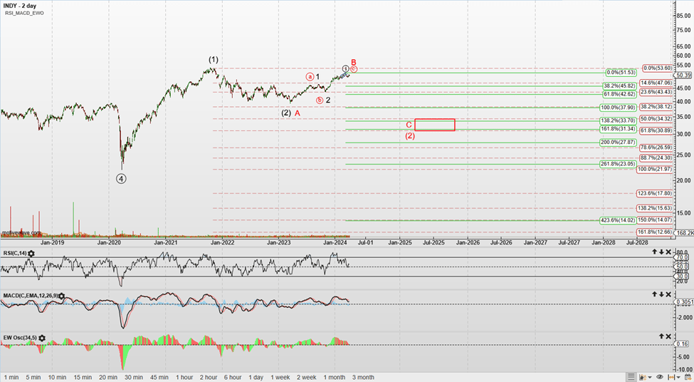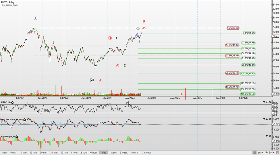 The Indian stock market, represented by INDY, is bullish long-term. There is a battle between two counts, black and red. Both need a correction in the short term; the difference is that the red count needs a deeper pullback. I have seen some experts suggest the black count, but my preference is red. By the way, in addition to various cycle methods, we often use EW analysis in our premium content.