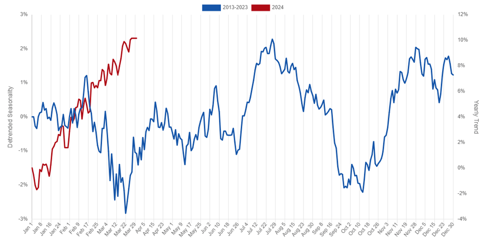Now, we have the traditional “Sell in May and Go Away” seasonality with an April peak. Will it happen this year? We shall see. All intermediate- and longer-term cycles are expected to roll over, except the strong 3.5-year cycle that should be pressing up until late 2025 or early 2026. This cycle may have delayed the peak of 2.1 and 2.7-year cycles, which is referred to as right translation in cycle lingo.