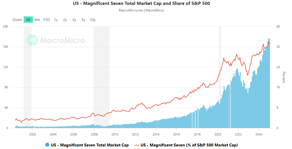 The chart below shows the market capitalization growth and corresponding share of Magnificent 7 companies between the years 2000 and 2024.
