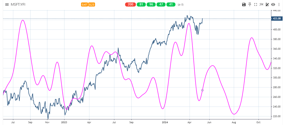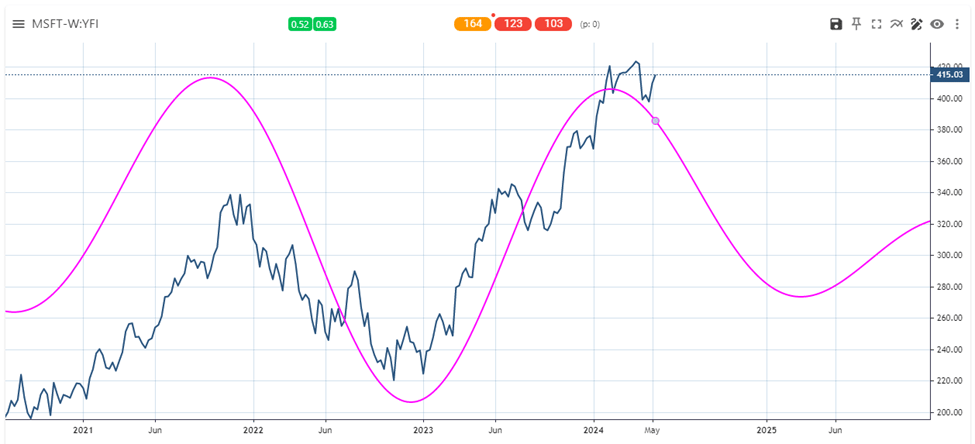 · The cycles from the daily chart suggest that MSFT can continue to rally toward mid-June. A new high is very likely.