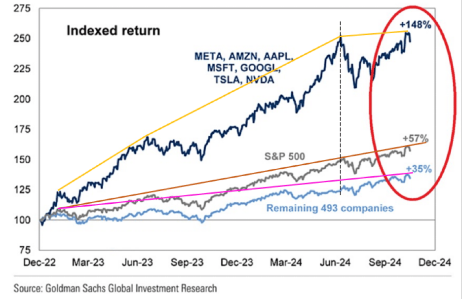The slope of return of Magnificent 7 was much steeper than that of other companies in the S&P 500 until the summer of 2024, and then it decelerated.