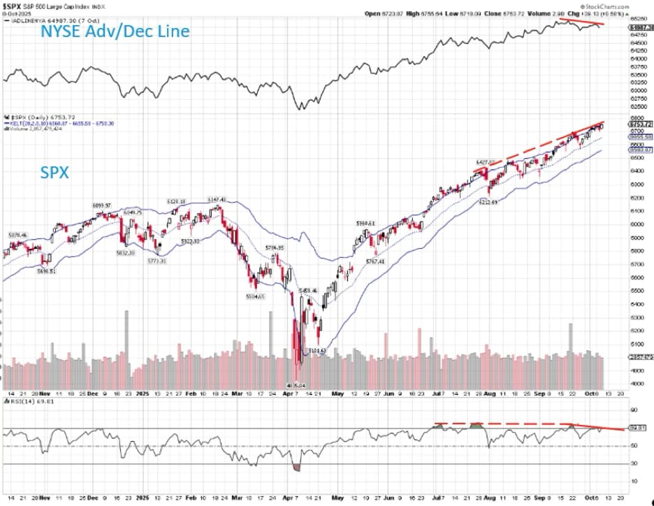 The NYSE Advance-Decline Line and RSI are also negatively diverging.