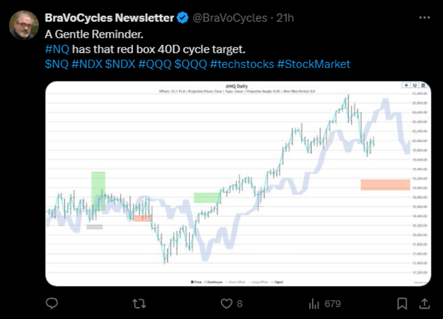 Consider following me on X (former Twitter) for your benefit. My posts in the newsletter and on X go like “hand in glove.” Below is an important timely post on X from Tuesday afternoon that showed an open target for NDX that was satisfied on Wednesday.